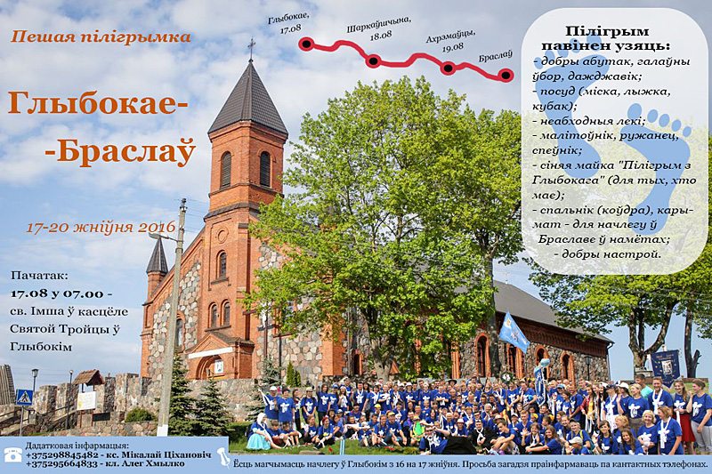 Пешая пілігрымка з Глыбокага распачнецца 17 жніўня ў 7.00 святой Імшой у парафіяльным касцёле. У дарозе да санктуарыя Маці Божай Валадаркі азёраў у Браславе пілігрымы будуць ісці тры дні.