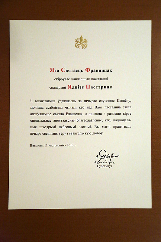 "Спадарыні Ядвізе Пастэрнак з удзячнасцю за ўсё тое, што Вы зрабілі і робіце для Касцёла. Прашу Вас маліцца за мяне. Няхай Пан Бог Вас благаславіць, а Багародзіца Вас аберагае. Францішак", - піша Святы Айцец.