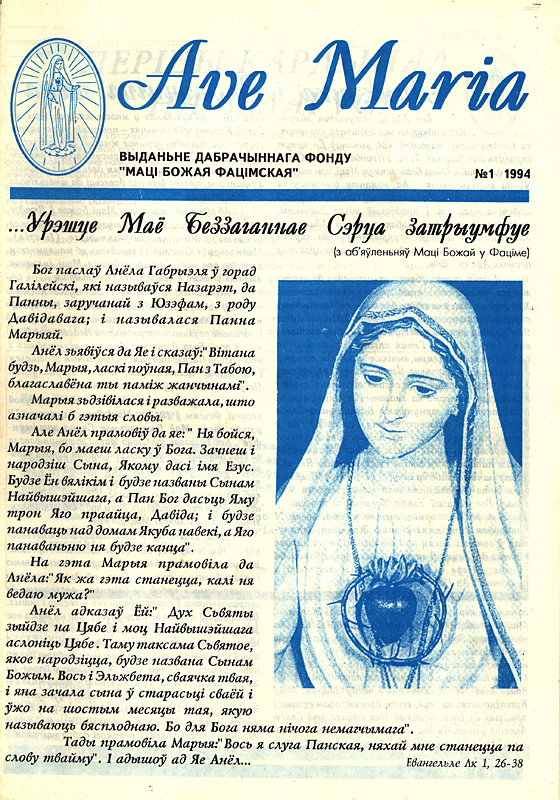 «Ave Maria» — назвалі мы сваю газету, бо старонкі яе збіраемся прысвячаць найперш марыйнай тэматыцы, — пісала рэдакцыя ў першым нумары. — Перакананыя, што сучаснаму, зблуканаму ў матэрыяльнай цемры, чалавеку вельмі неабходна свято прарочых словаў Маці Божай, прыклад як мацярынскай ахвяры і цярпення».