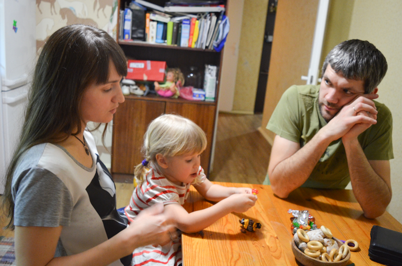 Ганна і Раман Рамановічы — хрысціянская каталіцкая сям’я з Мінска, якая мае траіх дзяцей. Пакуль карэспандэнт чакаў на размову тату і маму, старэйшымі дзецьмі былі прадэманстраваны самыя важныя рэчы, як сказаў старэйшы сын Ромка, — свечка, а таксама абраз Езуса, аранжавы гадзіннік і падарунак ад бабулі, які блішчыць. Ромчына ж сястрычка Мар’янка, калі нарэшце тата і мама прыйшлі, бо за сцяною ўжо не плакала, а спала стомленая за дзень важнымі справамі Бася, побач з дыктафонам пачала спяваць “Бог, прыйдзі да нас”.
