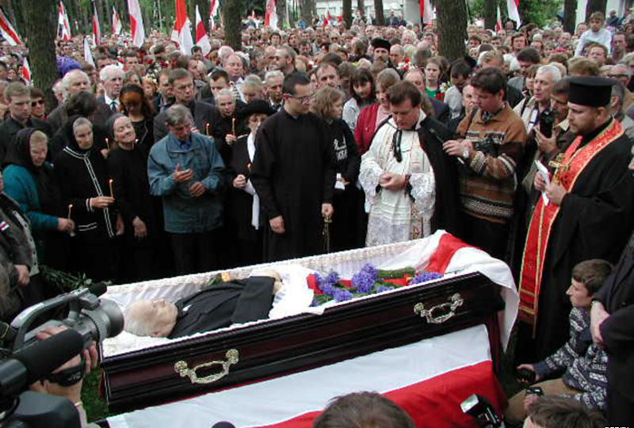 Ксёндз Уладзіслаў Завальнюк на пахаванні Васіля Быкава. «Калі вы будзеце трываць у слове Маім, то сапраўды будзеце вучнямі Маімі і пазнаеце праўду, а праўда вызваліць вас», — гэтыя словы Езуса, як падаецца, цалкам адпавядаюць таму жыццю, якое пражыў Васіль Быкаў. «Чалавек, як i кожная жывая iстота ад Бога, нараджаецца свабодным», — казаў сам Васіль Уладзіміравіч. Гэта быў пісьменнік, які праз любоў да праўды прыйшоў да Хрыста і свабоды. |