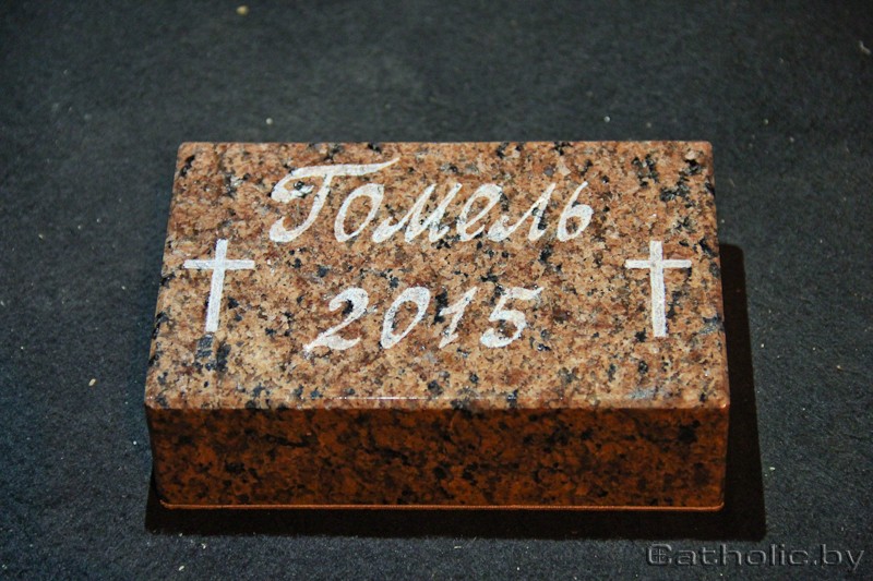 Падчас сустрэчы Пантыфік благаславіў вуглавы камень пад будаўніцтва новага касцёла ў Гомелі, які носіць той жа тытул, што мела разбураная ў 1938 г. каталіцкая святыня – Унебаўзяцця Найсвяцейшай Панны Марыі. Незадоўга да знішчэння гэтага касцёла былі растраляны святары, якія ў ім служылі. Папа Францішак уласнаручна падпісаў акт благаслаўлення вуглавога каменя, як знак апостальскага благаслаўлення ўсім жыхарам Гомеля, на долю якіх у апошнія дзесяцігоддзі выпалі цяжкія выпрабаванні. Пантыфік папрасіў Апостальскага Нунцыя запэўніць членаў каталіцкай і праваслаўнай супольнасцяў Беларусі, а таксама ўсіх жыхароў краіны, у сваёй малітоўнай памяці. Паводле паведамлення Апостальскай Нунцыятуры ў Рэспубліцы Беларусь