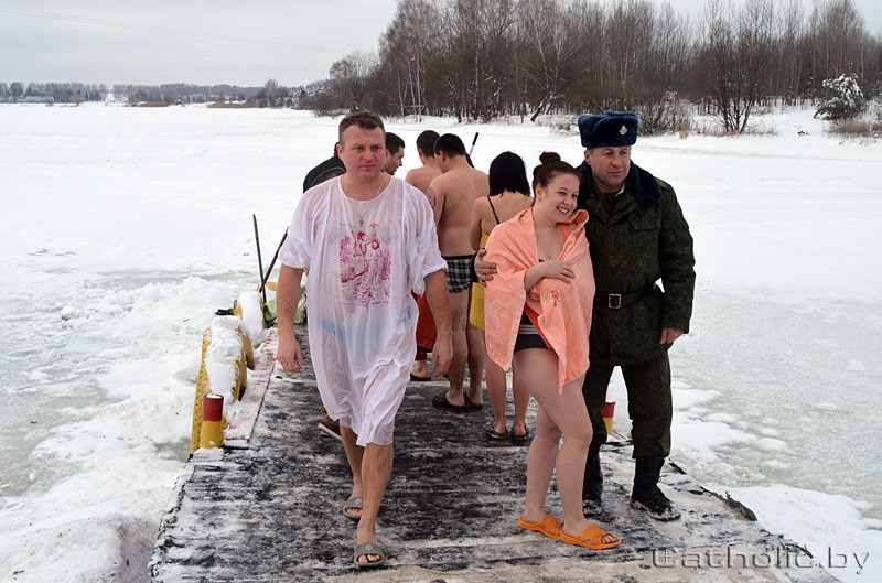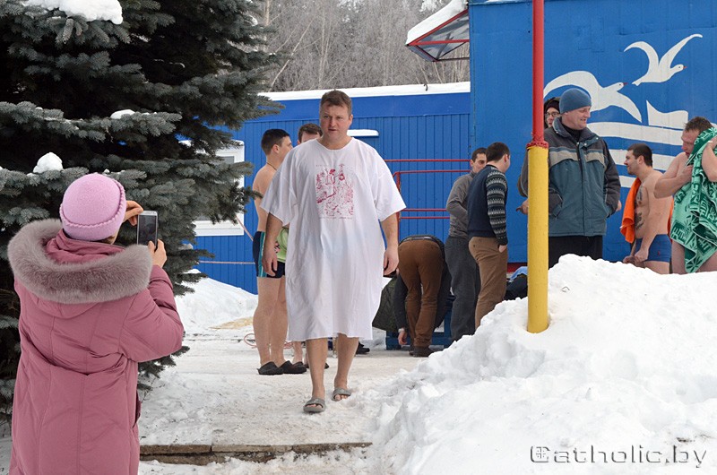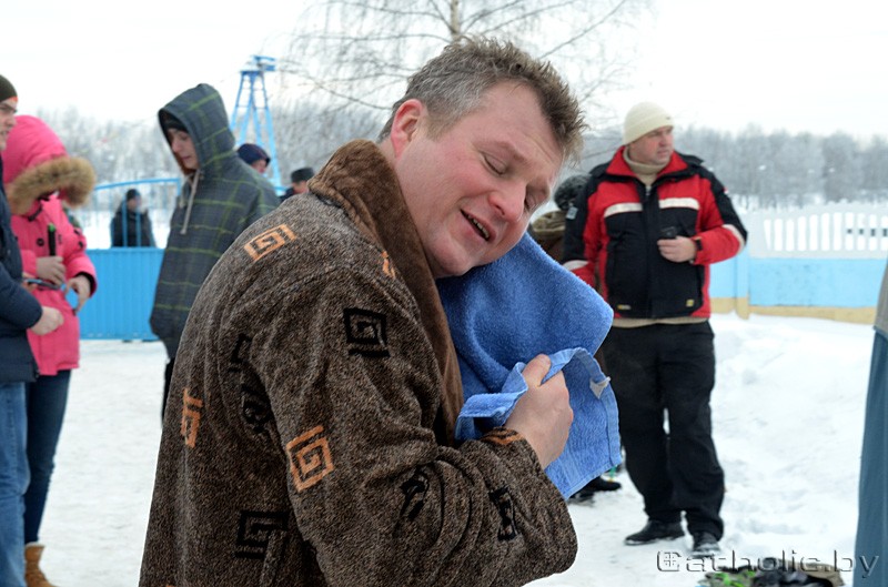 Ксёндз Францішак выходзіць з вады, саступаючы дарогу чарговым ахвотным акунуцца. «Якія мае адчуванні? Не ведаю, з чым іх параўнаць. На целе прыемнае лёгкае паколванне», — усміхаецца святар.