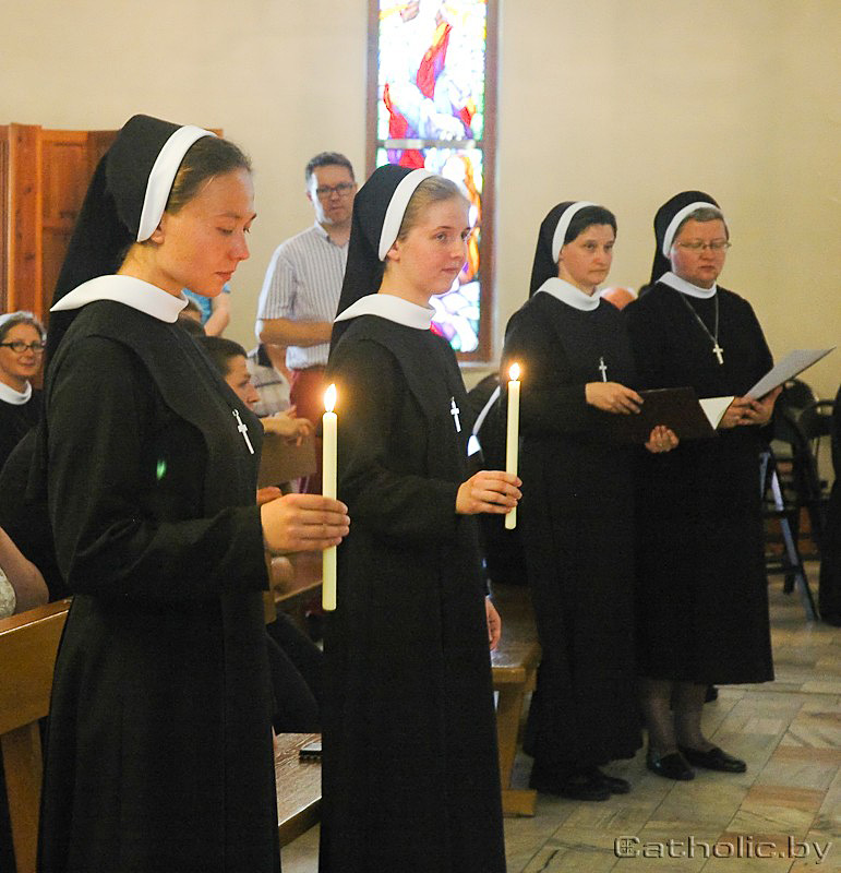 На фота: с. Ганна Мацуль CSFN (першая злева) падчас складання першых манаскіх абяцанняў «Доўгі час я шукала адказу на пытанне, ці сапраўды Бог мяне кліча, — распавядае манахіня. — Сёння магу сказаць толькі тое, што Ён даваў і працягвае даваць сваё святло». «Манах павінен стаць прарокам», або што такое манаства? Кансэкраваная асоба не можа мець маёмасці, уласных грошай. Яна падпарадкоўваецца настаяцелю і супольнасці, у якой жыве. Ці не пужаюць законнікаў гэтыя рэчы? Абое шчучынцаў адзначаюць, што зусім не — манаскае жыццё з абяцаннямі чыстасці, убоства і паслухмянасці выхоўвае чалавека і вучыць яго найперш пакоры. «Манаскае жыццё — прыгожае жыццё, яно вучыць шукаць Бога ў бліжнім», — гаворыць с. Ганна.
