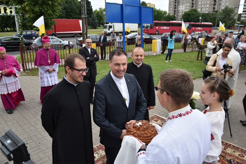 Уступнае слова на пачатак Імшы прамовіў Мітрапаліт Тадэвуш Кандрусевіч. Іерарх падзякаваў Генеральнаму настаяцелю за адданую працу салезіянскай сям’і ў Беларусі, параўнаўшы яе з будаўніцтвам касцёла, які закладзены на моцным фундаменце, як і салезіянская сям’я закладзена на фундаменце фармацыі святога Яна Боско. Касцёл, па словах арцыпастыра, мае вялікі мур, як вялікія духоўныя мэты маюць салезіяне, але працы як у будаўніцтве, так і ў развіцці салезіянскай сям’і ў Беларусі яшчэ вельмі шмат.