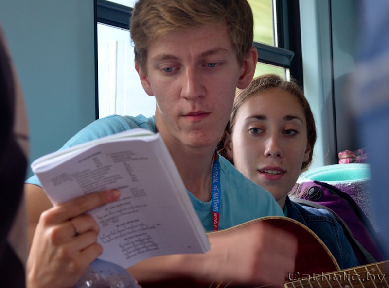 Атмасфера цягніка — самая «СДМаўская»: восем гадзін спеваў, якія перамяжоўваюцца тым, каб спыніцца і з'есці бутэрброд, а потым зноў спяваць. Бліжэй да Кракава — якраз каля трэцяй гадзіне дня — молімся разам Вяночак: мы па-беларуску, польская моладзь — па-польску. Застаецца яшчэ крыху. Спяваем разам, усміхаеімся адзін аднаму. Усё адбываецца ў рытме СДМ: крыху хвалявання і безліч радасці. Прыгоды для тых, хто жадае радавацца з Касцёлам, пачынаюцца.