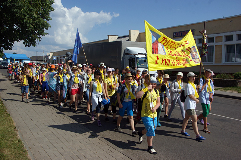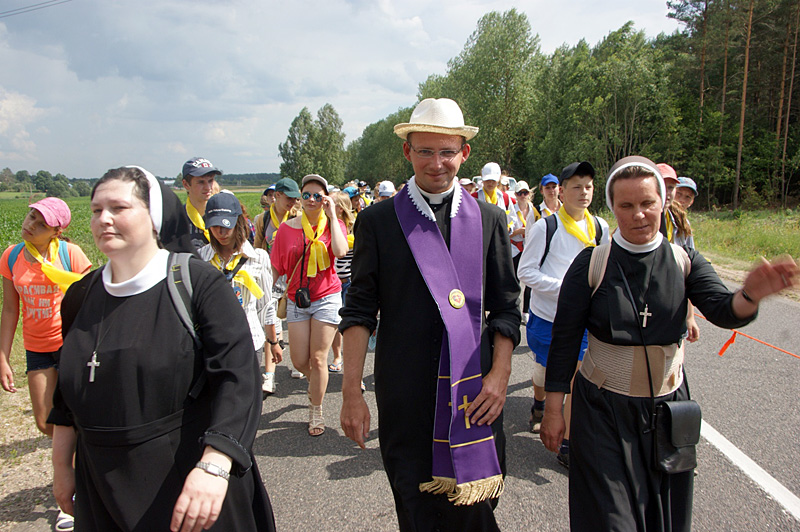 Ідуць да дому Маці, якая ўжо даўно выбрала для сябе святое месца ў Тракелях. Там асабліва можна адчуць прысутнасць Бога, там — як дома. Гэтая пілігрымка незвычайная па некалькіх прычынах. Яна выключная тым, што ў ёй ідуць адметныя людзі, бо проста няма падобных людзей: кожны прыносіць штосьці сваё, узаемна ўзбагачаючыся ад іншых. Выключная, бо з самага пачатку арганізавана ксяндзом Янам Гавецкім — дэканам Іўя, які кожны год, ідучы першым, дае прыклад моладзевага запалу. Выключная, бо закранае ўсе парафіі дэканату, збіраючы пілігрымаў з кожнай парафіяльнай супольнасці, дзе ўсе становяцца адным. Па дарозе пілігрымы ўдзельнічаюць у канферэнцыях, Імшах, дзеляцца сведчаннем свайго жыцця, наведваюць вёскі, мясцовасці, дзе таксама дзеляцца сведчаннем, даючы добры прыклад, але найперш нясуць радасць - аснову кожнай пілігрымкі. Без радасці не будзе аніякай атмасферы. Без радасці ніхто не адолее аніводнага кіламетра. Радасць дазваляе чалавеку ісці наперад, ісці з адвагай… Атмасферу радаснага крочання мне было дадзена адчуць 9 ліпеня, калі я далучыўся да гэтай пілігрымкі. Нягледзячы на тое, што надвор’е ў той дзень было вельмі зменлівае, бо то дождж ішоў, то свяціла спякотнае сонца, якое цёплымі прамянямі дакраналася да ўсіх, так што папярэдне змочанае адзенне зноў станавілася сухім. Самым малодшым удзельнікам пілігрымкі з’яўляецца Аўрымас, якому 1 год і 7 месяцаў. Як высветлілася, хлопчык у пілігрымку ідзе трэці раз. Як такое можа быць? Кс. Юрый Марціновіч, (AYU) |