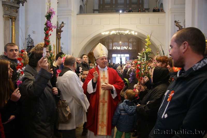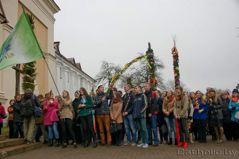 У гэты дзень маладыя вернікі прынеслі пальмовыя галінкі – сімвал жыцця, якое адраджаецца. У Гродне ўжо шмат гадоў існуе прыгожая традыцыя: моладзь прыязджае з вялікімі пальмамі, а яе ўдзел у набажэнствах разам са сваімі душпастырамі сведчыць аб адраджэнні Касцёла на Гродзеншчыне. Пасля асвячэння пальмаў біскупам Аляксандрам Кашкевічам, на ўзор людзей, што віталі Езуса пры ўваходзе ў Ерузалем, маладыя вернікі вырушылі з пабернардынскага ўзгорка з пальмовымі галінкамі да катэдральнага касцёла св. Францішка Ксаверыя.