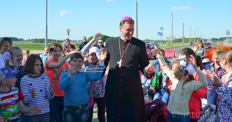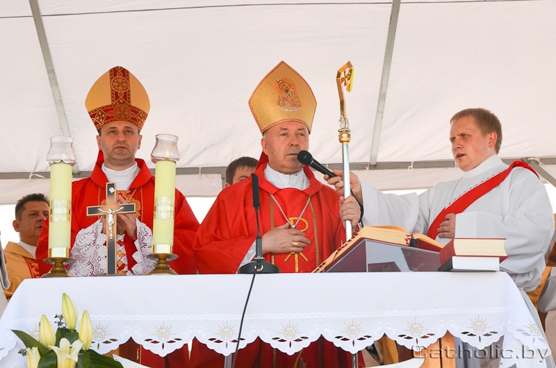 Урачыстую Імшу, на якой была асвечана пляцоўка і крыж, цэлебраваў біскуп Аляксандр Кашкевіч. У гаміліі біскуп падкрэсліў значэнне і ролю Святога Духа ў хрысціянскім жыцці, які заўсёды суправаджае Касцёл і чалавека. «Патрэба, каб Святы Дух нас суцяшаў, азначае ўзмацненне нашай веры, узбагачэнне звышнатуральнага жыцця, раз’ясненне гарызонтаў нашага мыслення, якое часта вельмі зямное, поўнае страху і няўпэўненасці», — дадаў іерарх. Кажучы пра парафіяльную святыню, якая павінна паўстаць, біскуп Аляксандр Кашкевіч адзначыў, што яна стане «парафіяльным Вячэрнікам». «Вы будзеце прыходзіць у гэты Вячэрнік, каб атрымаць ад Хрыста самае каштоўнае — Яго збаўчае Слова і Найсвяцейшае Цела. Вы будзеце сюды прыходзіць, каб адчуць моц і любоў Бога ў святых сакрамэнтах. Вы будзеце прыходзіць у гэты касцёл цэлымі сем’ямі, каб яны былі моцныя Богам. Каб вы самі маглі адчуць, што разам з’яўляецеся членамі іншай, яшчэ большай сям’і — парафіі», — казаў іерарх. Біскуп дадаў, што гэты парафіяльны Вячэрнік будзе месцам, дзе «парафіяне будуць вучыцца сустракаць Хрыста ў іншым чалавеку, прыходзіць да яго з дапамогай, дзяліцца з ім радасцю веры». «Як Апосталы, сабраныя ў Вячэрніку ў чаканні спаслання Святога Духа, аднадумна трывалі на малітве, вы будзеце аднадумна прасіць Хрыста аб стойкасці ў веры для сябе і для сваіх блізкіх, а таксама аб дары веры для тых, хто яшчэ яе не мае», — сказаў біскуп. Чакае нялёгкае заданне