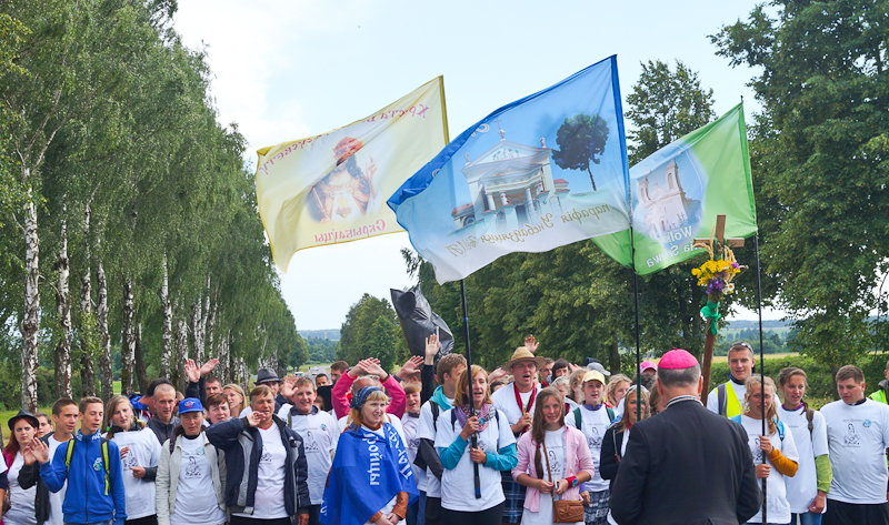 Ужо традыцыйна ўсіх пілігрымаў яшчэ па дарозе ў Тракелі вітаў біскуп Гродзенскі Аляксандр Кашкевіч, які благаславіў і дзякаваў за прыгожае сведчанне веры. Іерарх прасіў пілігрымаў аддаць Маці Божай усе свае цяжкасці і турботы, бо толькі Яна зможа перамяніць усё гэта ў незвычайную радасць.