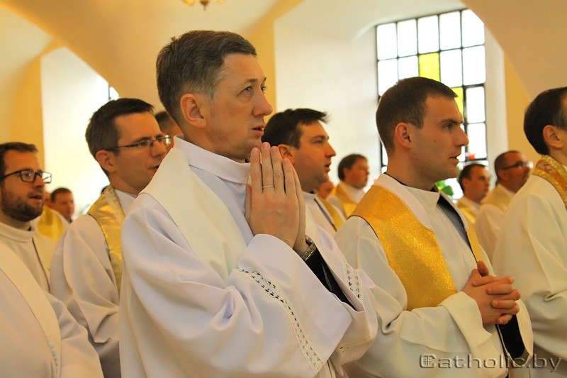 Потым а. Андрэй Шчупал заахвочваў, каб кожны святар з самага пачатку ставіў для сябе высокія патрабаванні, а ў цэнтр свайго жыцця заўсёды ставіў Езуса Хрыста і быў да распараджэння сваіх вернікаў. Святую Імшу падчас сустрэчы ўзначаліў біскуп Гродзенскі Аляксандр Кашкевіч, які на пачатку літургіі агучыў інтэнцыі малітваў. Асаблівым чынам іерарх заклікаў да малітвы за Святога Айца Францішка, за працу Сінода Біскупаў, пасяджэнні якога прысвечаны праблемам сям’і, і за самі сужэнствы і сем’і. На Імшы таксама быў прысутны дапаможны біскуп Гродзенскай дыяцэзіі Юзаф Станеўскі.