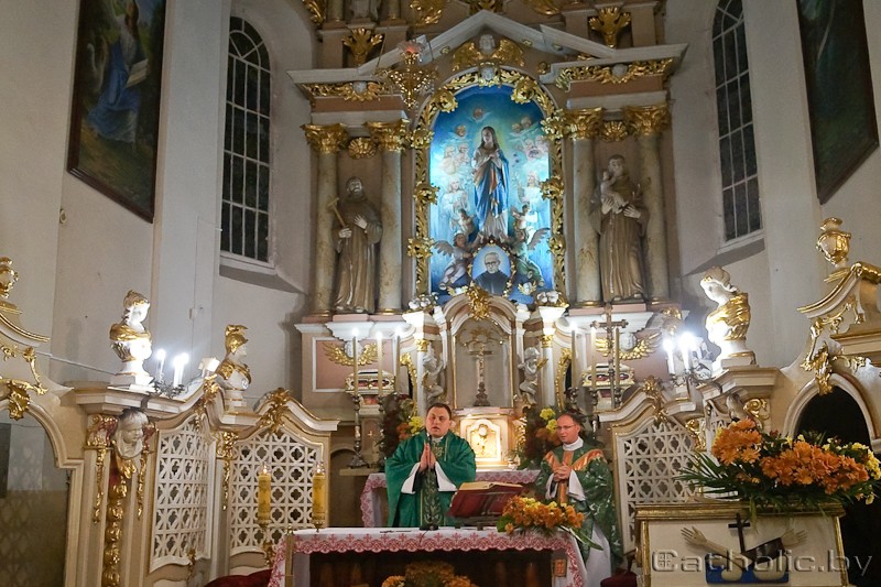 Святую Імшу ўзначаліў а. Антоні Пажэцкі OFMConv, пробашч парафіі Маці Божай Анёльскай, які падзякаваў вернікам за прывязанасць да Панны Марыі і пашырэнне Яе культу ў сваіх дамах і сем’ях. Ксёндз Юрый Марціновіч у гаміліі, разважаючы над чытаннем Евангелля, казаў аб служэнні, дасканалы ўзор якога пакінуў сам Хрыстус. Святар адзначыў, што праз служэнне на розных этапах свайго жыцця чалавек павінен заслужыць таго, каб “заняць прывілеяванае месца ў хвале Езуса Хрыста”.