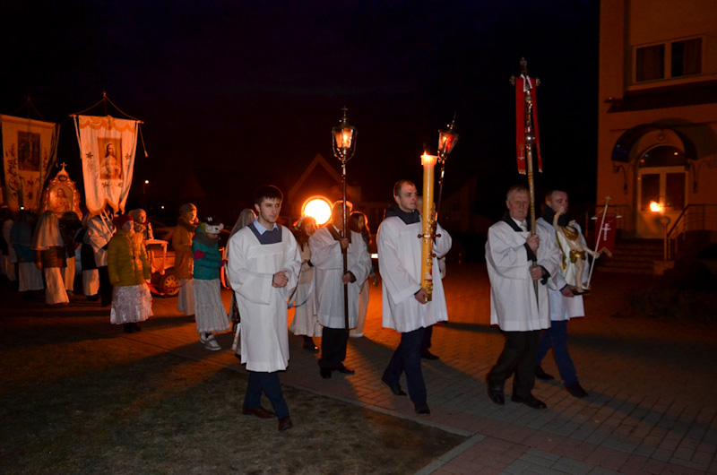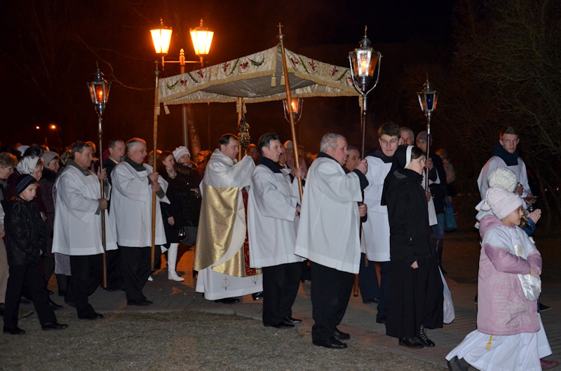 А шостай гадзіне раніцы перазвон званоў лідскага фарнага касцёла абвясціў на ўсе ваколіцы радасную навіну аб Уваскрасенні Езуса Хрыста. Вялікая колькасць вернікаў, не зважаючы на ранні час, прыняла ўдзел у працэсіі і рэзурэкцыйнай святой Імшы.