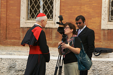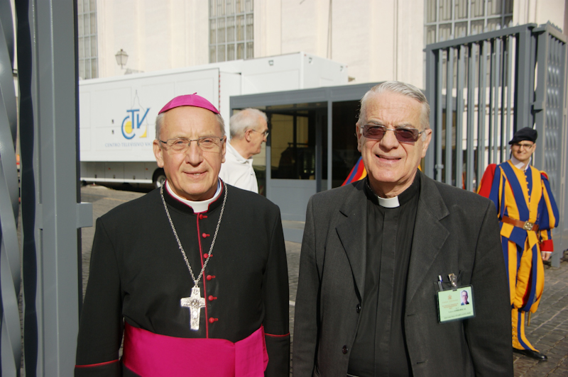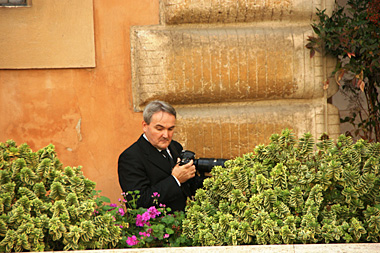 Магчыма, хтосьці з іх ужо браў слова? 4. Фотарэпарцёры пільнуюць іерархаў і на вуліцы, хаваючыся часам у кустах «Прамовы біскупаў не публікуюцца, чаго раней не было. Таксама нельга агучваць тое, аб чым гаворыцца на Сінодзе. Аднак штодзень у прэс-цэнтры праходзіць адмысловы брыфінг. Таксама ў зале Сіноду нельга мець пры сабе ніякіх прыстасаванняў для запісу. Як я ўжо ўзгадаў, адзіная інфармацыя даецца на штодзённых брыфінгах. Аднак інтэрв'ю даваць не забаронена». (Вытрымка з інтэрв'ю абп. Тадэвуша Кандрусевіча для Catholic.by 06.10.14) 5. Мітрапаліт Тадэвуш Кандрусевіч у ходзе працы Сінода размаўляе з многімі, у тым ліку з а. Фэдэрыко Ламбардзі, прэс-сакратаром Ватыкана «З кім з біскупаў падчас працы Сіноду Вы размаўляеце найбольш? — Ва Урбаніянуме мы шмат размаўляем адзін з адным (біскупы з розных краін) найчасцей падчас пасілкаў. Пасля іх біскупы або адпачываюць, або пішуць водгукі для СМІ сваіх краін (што раблю таксама і я). Падчас Сіноду найбольш размаўляю з тымі біскупамі, хто сядзіць побач са мной — гэта біскупы з Чэхіі і Румыніі. Падчас перапынкаў на каву — з іншымі ўдзельнікамі Сіноду». (Вытрымка з інтэрв'ю абп. Тадэвуша Кандрусевіча для Catholic.by 11.10.14)Іншыя фотаімгненні — у фотарэпартажы кс. Юрыя Марціновіча па спасылцы (IL) |
