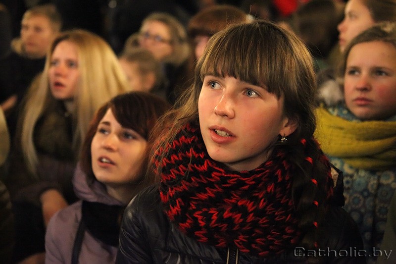 Падчас святой Імшы моладзь прынесла да алтара свае дары: хусцінку з лагатыпам Года Божай Міласэрнасці, святарскую стулу, хустку Веранікі, сімвалічныя “сляды” дзяцей з добрымі ўчынкамі, а таксама віно і ваду – сімвалы Эўхарыстыі. На заканчэнне святой Імшы іерарх пажадаў маладым католікам, каб яны былі сапраўдным «Божым фундаментам Міласэрнасці», а таксама каб не баяліся знаёміцца падчас гэтага чування адзін з адным і набываць новых сяброў. Словы біскупа моладзь падхапіла, і ўжо ў перапынках паміж пунктамі праграмы, а таксама падчас кава-паўзы, быў чутны гоман і вясёлыя размовы. Глыбей адчуць Божую міласэрнасць у гэты вечар дапамагала моладзі не толькі малітва, але і творчасць. Дзве арыгінальныя сцэнкі, якія паказалі маладыя католікі з Нарачы і Мінска, распавядалі пра розныя выпадкі праяўлення міласэрнасці Бога да чалавека.
