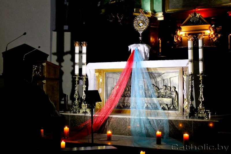 Колькі ў табе Божых дароў! Калі б ты адкрыў іх у сабе, то змог бы адкрыць таксама і ў бліжніх. Бо любоў даходзіць часам да абсурду, калі чалавек становіцца для Бога важней за ўсё. Таму невыпадкова, што вы тут. Гэтай ноччу Бог хоча прамовіць вам штосьці важнае. І, напэўна, гэтыя словы будуць для вас словамі любові», — падкрэсліў кс. Валерый Марціноўскі. Міласэрнасць, паводле слоў святара, — гэта таксама змена ментальнасці, гэта найлепшая рэакцыя на бяду чалавека, веданне чалавека і імкненне зразумець яго сітуацыю; гэта «погляд на веру як на моц цярпення», але перадусім — гэта ўчынкі, учынкі для душы і цела бліжняга. Міласэрнасць — у чысціні цела і душы Паразважаць над пачутым, а таксама духоўна «акунуцца ў Божую міласэрнасць» удзельнікі сустрэчы змаглі падчас адарацыі Найсвяцейшага Сакрамэнту. Ружанец і Вяночак да Божай Міласэрнасці сталі магчымасцю добрага духоўнага падсілкавання для маладых сэрцаў. Святая Імша, якую цэлебраваў біскуп Антоні Дзям’янка, была цэнтральнай часткай сустрэчы.