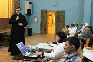 Затым кс. Адам Дынак звярнуўся да калектыву шпіталя з гаміліяй, прысвечанай Сусветнаму дню хворых і пазнаёміў прысутных з тэкстам звароту Святога Айца Францішка на гэты дзень. У сустрэчы прынялі ўдзел каля 400 медыкаў.