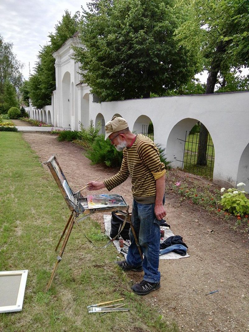 Пакуль да завяршэння пленэру яшчэ далёка, у мастакоў «кіпіць праца». Нават у дажджлівы дзень мастакі не сядзелі без працы, знайшлі цікавы аб’ект — гаспадара кс. Сяргея Сурыновіча: